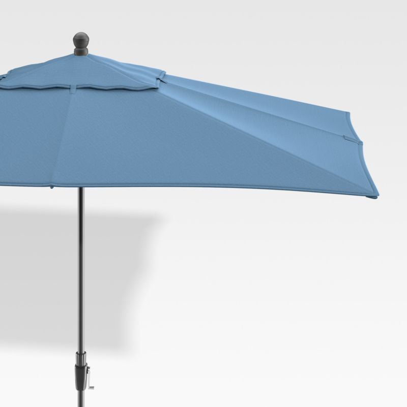 Our sapphire blue umbrella spreads an oversized rectangle of Sunbrella outdoor acrylic that blocks out 98% of the sun's UV rays. Sturdy aluminum pole with a black powdercoat has an easy-turn crank. The Rectangular Sunbrella Sapphire Umbrella with Black Frame is a Crate and Barrel exclusive.