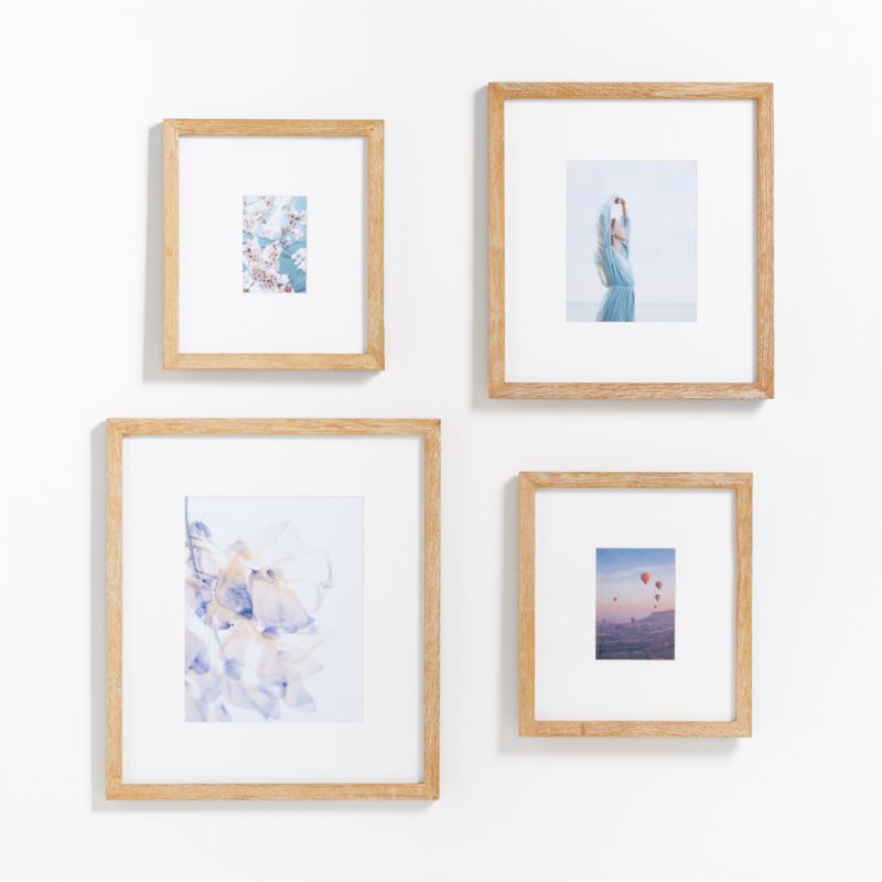 Create an instant gallery with this four-frame set. Our solid oak frames add organic warmth to photo displays with their flowing grain and off-white mats. A Crate & Barrel exclusive, the set unites 4"x6", 5"x7", 8"x10" and 11"x14" oak wood frames. Display the quartet in a grid, in a line down a hallway or arranged as a staggered gallery wall.