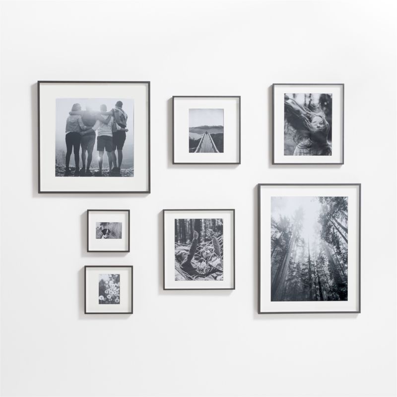 Create an instant gallery with this seven-frame set. Our brushed black frames add dark drama to photo displays with their shadow-box styling and oversized off-white mats. A Crate & Barrel exclusive, the set unites 4"x6", 5"x7", 8"x10", 18"x18" and 18"x24" frames and two 11"x14" frameswith a brushed gunmetal finish. Display the septet in a grid, in a line down a hallway or arranged as a staggered gallery wall.