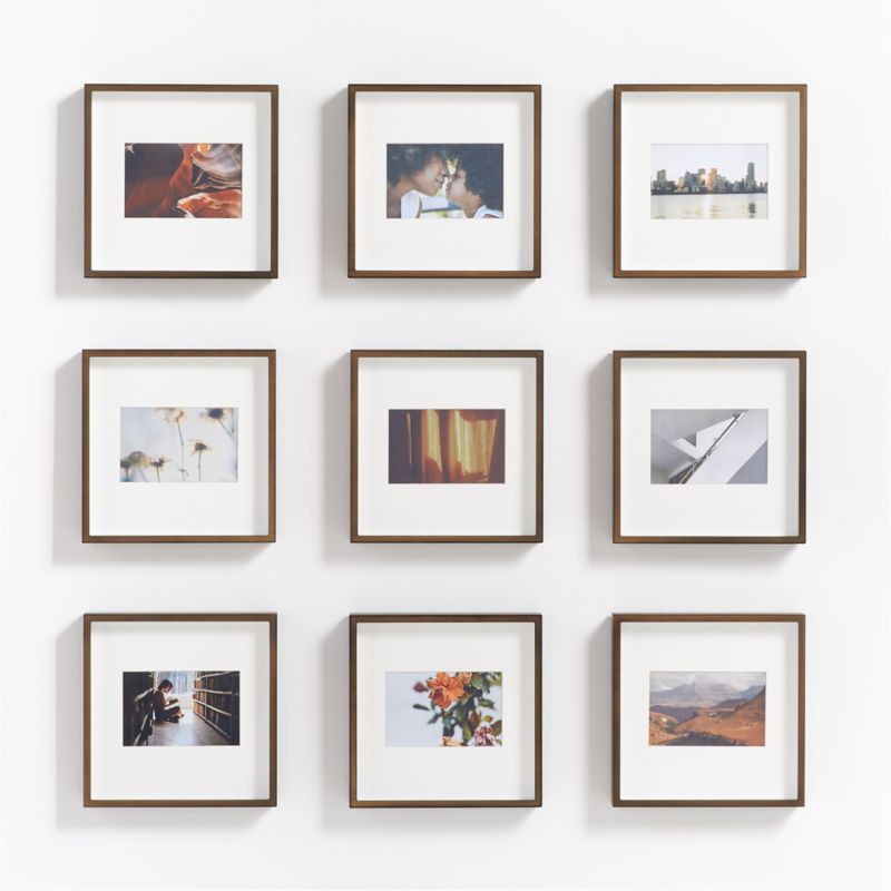 Create an instant gallery with this nine-frame set. Our brushed antique bronze frames add drama to photo displays with their shadow-box styling and oversized off-white mats. The square frames set off rectangular photos for a unique profile. A Crate & Barrel exclusive, the set of nine aluminum 4"x6" frames with a brushed antique bronze finish can be displayed in a grid, in a long line down a hallway or arranged as a staggered gallery wall.