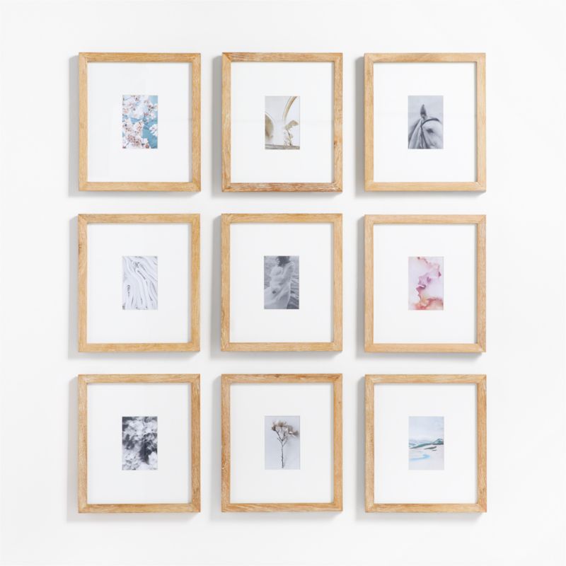 Create an instant gallery wall with this nine-frame set. Our solid oak frames add organic warmth to photo displays with their flowing grain and off-white mats. A Crate & Barrel exclusive, the set of nine 4"x6" light oak wood frames can be displayed in a grid or row or arranged as a staggered gallery wall.