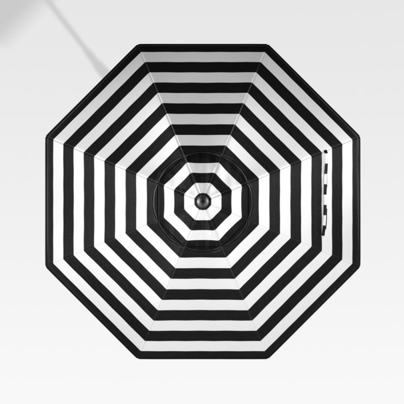 Recalling summer beaches, this classic black-and-white cabana stripe canopy is made of Sunbrella fabric, which blocks out 98% of the sun's rays while resisting stains, mold and mildew. Fitted for our 9' round umbrella frames in a variety of finishes (sold separately), our 9' Round Sunbrella ® Black Cabana Stripe Umbrella Canopy is a Crate and Barrel exclusive.