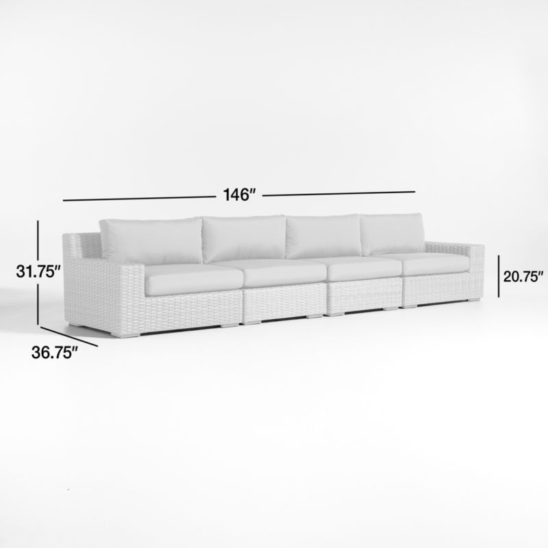 Low-slung and ready to lounge, our Abaco outdoor sectional sofa extends an invitation to kick back and relax. Comprising two armless sofas and left- and right-hand chairs, the four-piece sectional offers a deep seat and wide, boxy arms perfect for a cool drink. Handwoven with a chunky, textural weave, the weather-resistant resin wicker exhibits a variety of grey-brown shades to replicate the nuanced color of well-worn rattan. Graphite grey cushions covered in fade-, stain-, water- and mildew-resistant Sunbrella acrylic add an extra layer of comfort.
