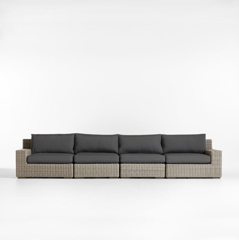 Low-slung and ready to lounge, our Abaco outdoor sectional sofa extends an invitation to kick back and relax. Comprising two armless sofas and left- and right-hand chairs, the four-piece sectional offers a deep seat and wide, boxy arms perfect for a cool drink. Handwoven with a chunky, textural weave, the weather-resistant resin wicker exhibits a variety of grey-brown shades to replicate the nuanced color of well-worn rattan. Cushions covered in fade-, stain-, water- and mildew-resistant Sunbrella acrylic add an extra layer of comfort.