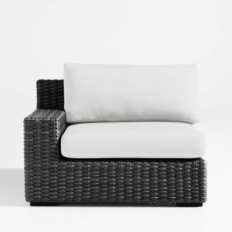 Low-slung and ready to lounge, our Abaco outdoor sectional collection extends an invitation to kick back and relax. Each left-arm lounge chair is handwoven in dark charcoal grey, weather-resistant resin wicker in a chunky, textural weave. The chair's modern, boldly proportioned frame of lightweight aluminum offers a deep seat and a wide, boxy arm that's perfect for hosting a cool drink. Neatly tailored with bullnose fronts and boxed sides, the off-white seat and back cushions add on a layer of comfort covered in fade-, stain-, water- and mildew-resistant Sunbrella acrylic. The left-arm lounge chair with cushions combines with other Abaco sectional components to fashion outdoor seating tailored to your great outdoors.