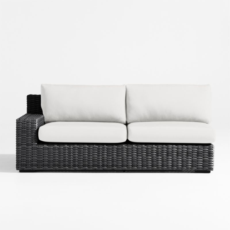 Low-slung and ready to lounge, our Abaco outdoor sectional collection extends an invitation to kick back and relax. Each dark charcoal grey left-arm sofa is handwoven of weather-resistant resin wicker in a chunky, textural weave. The sofa's modern, boldly proportioned frame of lightweight aluminum offers a deep seat and a wide, boxy arm that's perfect for hosting a cool drink. Neatly tailored with bullnose fronts and boxed sides, the off-white seat and back cushions add on a layer of comfort covered in fade-, stain-, water- and mildew-resistant Sunbrella acrylic. The left-arm sofa with cushions combines with other Abaco sectional components to fashion outdoor seating tailored to your great outdoors.