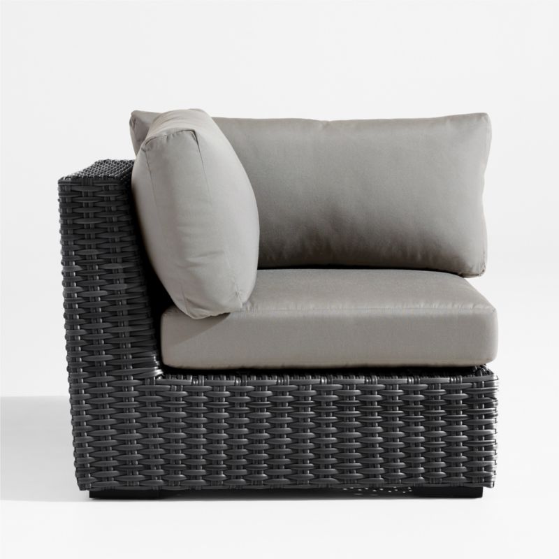 Low-slung and ready to lounge, our Abaco outdoor sectional collection extends an invitation to kick back and relax. Each corner chair is handwoven in dark charcoal grey, weather-resistant resin wicker in a chunky, textural weave. The chair's modern, boldly proportioned frame of lightweight aluminum offers a deep seat. Neatly tailored with bullnose fronts and boxed sides, the grey seat and back cushions add on a layer of comfort covered in fade-, stain-, water- and mildew-resistant Sunbrella acrylic. The corner with cushions combines with other Abaco sectional components to fashion outdoor seating tailored to your great outdoors.