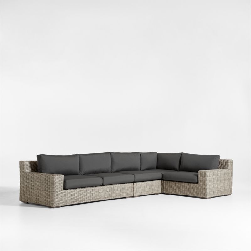 Low-slung and ready to lounge, our Abaco petite outdoor sectional sofa extends an invitation to kick back and relax. Comprising a left-arm sofa, corner, armless chair and right-arm chair, the L-shaped sectional offers a deep seat and wide, boxy arms perfect for a cool drink. Handwoven with a chunky, textural weave, the weather-resistant resin wicker exhibits a variety of grey-brown shades to replicate the nuanced color of well-worn rattan. Charcoal grey cushions covered in fade-, stain-, water- and mildew-resistant Sunbrella acrylic add an extra layer of comfort.