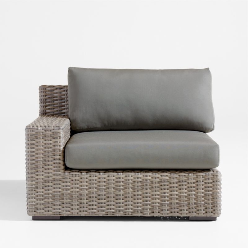 Low-slung and ready to lounge, our Abaco outdoor sectional collection extends an invitation to kick back and relax. Each left-arm lounge chair is handwoven in grey-brown, weather-resistant resin wicker in a chunky, textural weave. The chair's modern, boldly proportioned frame of lightweight aluminum offers a deep seat and a wide, boxy arm that's perfect for hosting a cool drink. Neatly tailored with bullnose fronts and boxed sides, the grey seat and back cushions add on a layer of comfort covered in fade-, stain-, water- and mildew-resistant Sunbrella acrylic. The left-arm lounge chair with cushions combines with other Abaco sectional components to fashion outdoor seating tailored to your great outdoors.