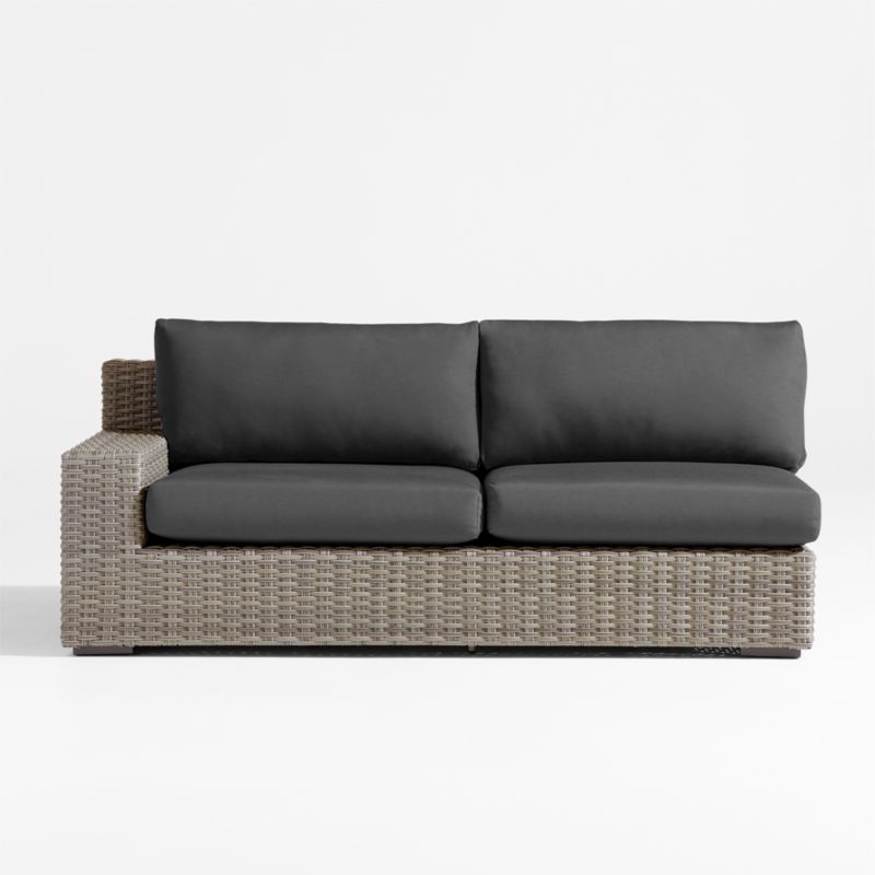 Low-slung and ready to lounge, our Abaco outdoor sectional collection extends an invitation to kick back and relax. Each left-arm sofa is handwoven in grey-brown, weather-resistant resin wicker in a chunky, textural weave. The sofa's modern, boldly proportioned frame of lightweight aluminum offers a deep seat and a wide, boxy arm that's perfect for hosting a cool drink. Neatly tailored with bullnose fronts and boxed sides, the dark charcoal grey seat and back cushions add on a layer of comfort covered in fade-, stain-, water- and mildew-resistant Sunbrella acrylic. The left-arm sofa with cushions combines with other Abaco sectional components to fashion outdoor seating tailored to your great outdoors.