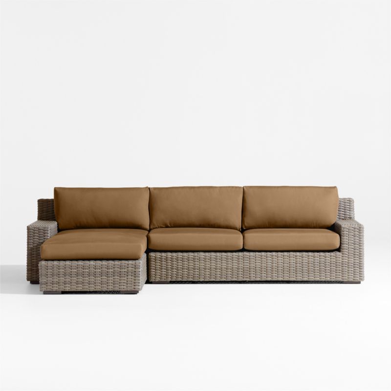 Low-slung and ready to lounge, our Abaco outdoor sectional sofa extends an invitation to kick back and relax. Comprising a left-arm chaise and right-arm sofa, the two-piece sectional offers a deep seat and wide, boxy arms perfect for a cool drink. Handwoven with a chunky, textural weave, the weather-resistant resin wicker exhibits a variety of grey-brown shades to replicate the nuanced color of well-worn rattan. Off-white cushions covered in fade-, stain-, water- and mildew-resistant Sunbrella acrylic add an extra layer of comfort.