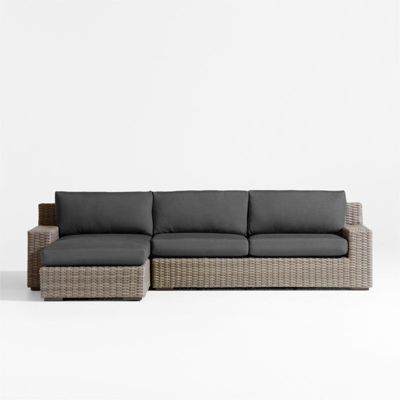 Low-slung and ready to lounge, our Abaco outdoor sectional sofa extends an invitation to kick back and relax. Comprising a left-arm chaise and right-arm sofa, the two-piece sectional offers a deep seat and wide, boxy arms perfect for a cool drink. Handwoven with a chunky, textural weave, the weather-resistant resin wicker exhibits a variety of grey-brown shades to replicate the nuanced color of well-worn rattan. charcoal grey cushions covered in fade-, stain-, water- and mildew-resistant Sunbrella acrylic add an extra layer of comfort.