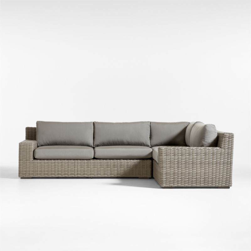 Low-slung and ready to lounge, our Abaco petite outdoor sectional sofa extends an invitation to kick back and relax. Comprising a right-arm chair, corner and left-arm sofa, the L-shaped sectional offers a deep seat and wide, boxy arms perfect for a cool drink. Handwoven with a chunky, textural weave, the weather-resistant resin wicker exhibits a variety of grey-brown shades to replicate the nuanced color of well-worn rattan. Graphite grey cushions covered in fade-, stain-, water- and mildew-resistant Sunbrella acrylic add an extra layer of comfort.