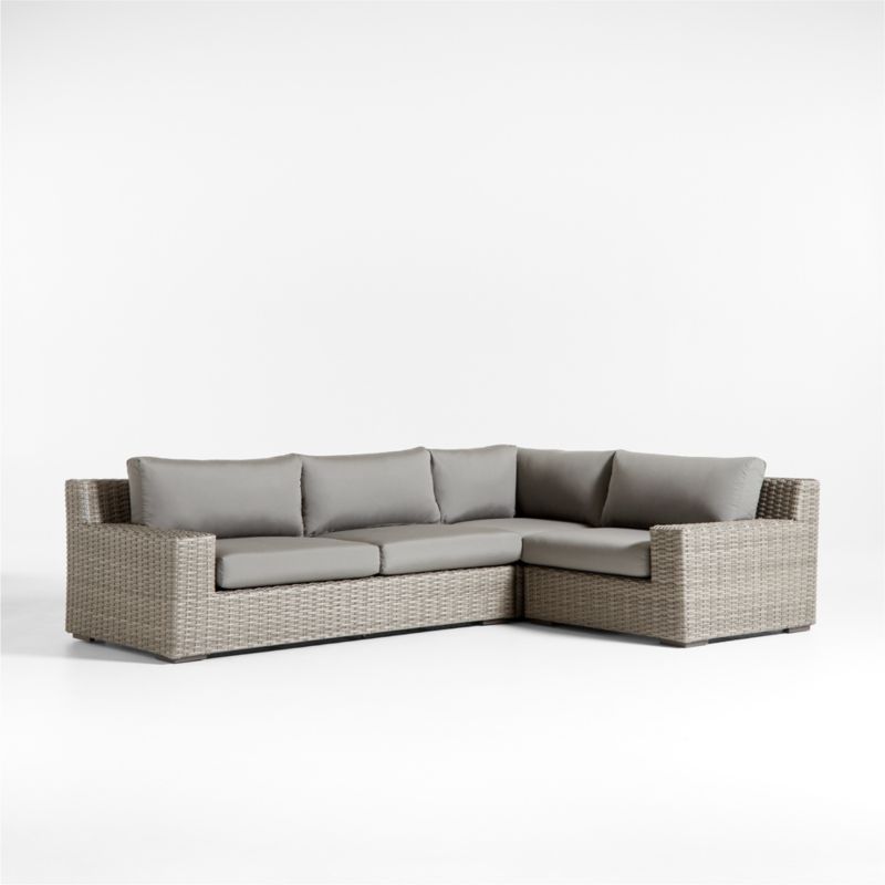 Low-slung and ready to lounge, our Abaco outdoor sectional sofa extends an invitation to kick back and relax. Comprising two armless sofas and left- and right-hand chairs, the four-piece sectional offers a deep seat and wide, boxy arms perfect for a cool drink. Handwoven with a chunky, textural weave, the weather-resistant resin wicker exhibits a variety of grey-brown shades to replicate the nuanced color of well-worn rattan. Graphite grey cushions covered in fade-, stain-, water- and mildew-resistant Sunbrella acrylic add an extra layer of comfort.