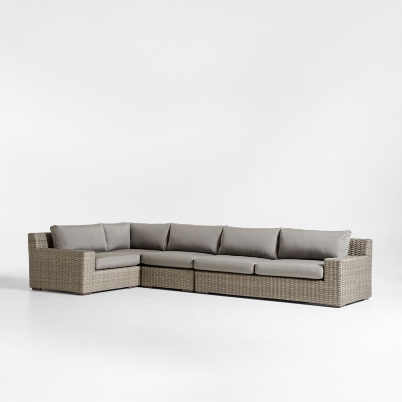Low-slung and ready to lounge, our Abaco outdoor sectional sofa extends an invitation to kick back and relax. Comprising two armless sofas and left- and right-hand chairs, the four-piece sectional offers a deep seat and wide, boxy arms perfect for a cool drink. Handwoven with a chunky, textural weave, the weather-resistant resin wicker exhibits a variety of grey-brown shades to replicate the nuanced color of well-worn rattan. Graphite grey cushions covered in fade-, stain-, water- and mildew-resistant Sunbrella acrylic add an extra layer of comfort.