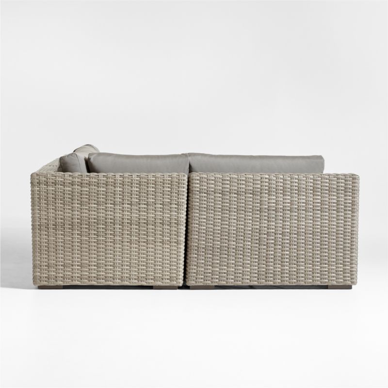 Low-slung and ready to lounge, our Abaco petite outdoor sectional sofa extends an invitation to kick back and relax. Comprising a left-arm chair, corner, armless chair and right-arm sofa, the L-shaped sectional offers a deep seat and wide, boxy arms perfect for a cool drink. Handwoven with a chunky, textural weave, the weather-resistant resin wicker exhibits a variety of grey-brown shades to replicate the nuanced color of well-worn rattan. Graphite grey cushions covered in fade-, stain-, water- and mildew-resistant Sunbrella acrylic add an extra layer of comfort.