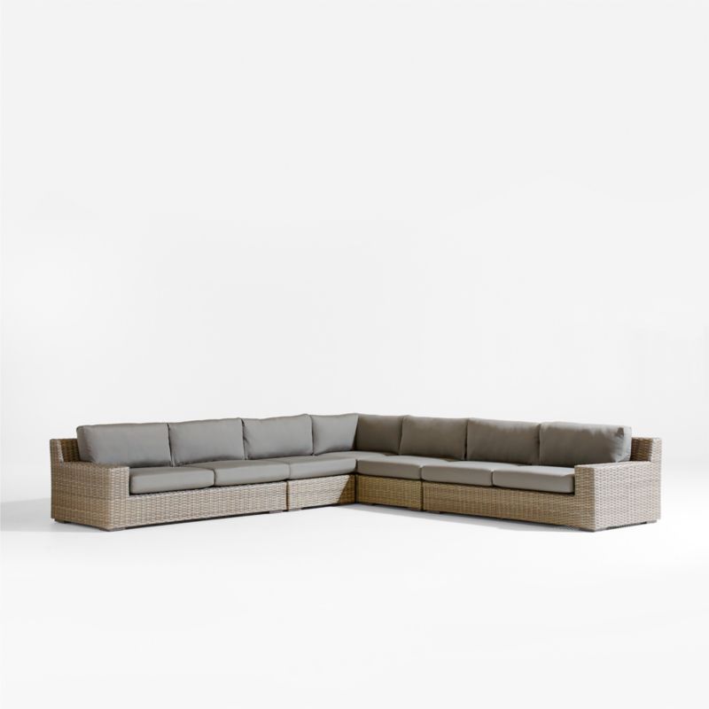 Low-slung and ready to lounge, our Abaco outdoor sectional sofa extends an invitation to kick back and relax. Comprising a corner, two armless chairs and left- and right-arm sofas, the five-piece sectional offers a deep seat and wide, boxy arms perfect for a cool drink. Handwoven with a chunky, textural weave, the weather-resistant resin wicker exhibits a variety of grey-brown shades to replicate the nuanced color of well-worn rattan. Graphite grey cushions covered in fade-, stain-, water- and mildew-resistant Sunbrella acrylic add an extra layer of comfort to the L-shaped sectional.