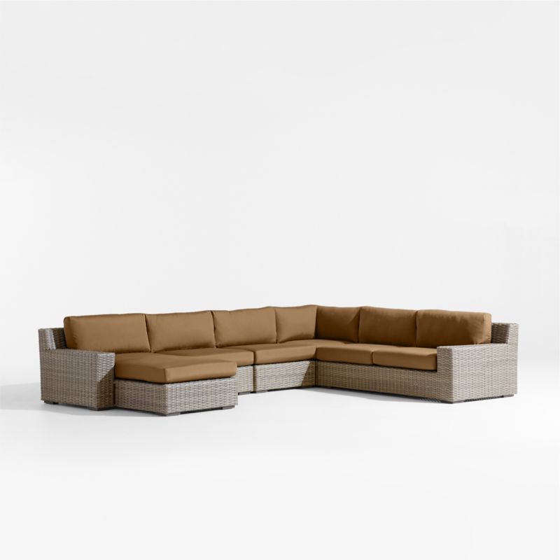 Low-slung and ready to lounge, our Abaco outdoor sectional sofa extends an invitation to kick back and relax. Comprising a left-arm chaise, corner, two armless chairs and right-arm sofa, the five-piece sectional offers a deep seat and wide, boxy arms perfect for a cool drink. Handwoven with a chunky, textural weave, the weather-resistant resin wicker exhibits a variety of grey-brown shades to replicate the nuanced color of well-worn rattan. Off-white cushions covered in fade-, stain-, water- and mildew-resistant Sunbrella acrylic add an extra layer of comfort.