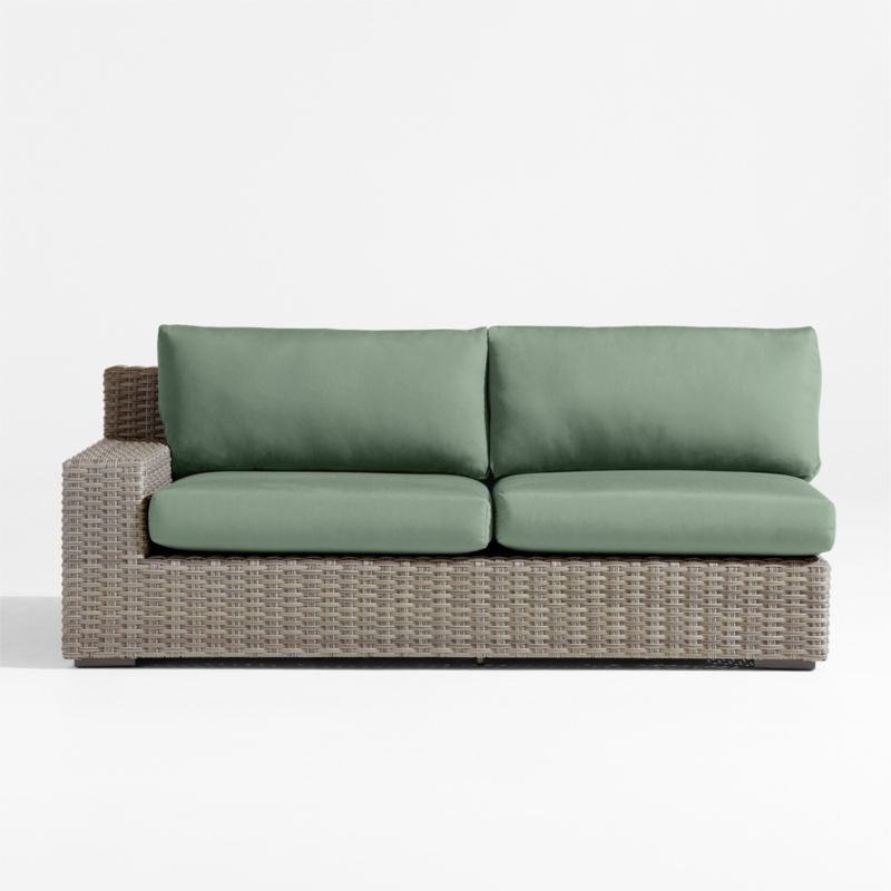 Low-slung and ready to lounge, our Abaco outdoor sectional collection extends an invitation to kick back and relax. Each left-arm sofa is handwoven in grey-brown, weather-resistant resin wicker in a chunky, textural weave. The sofa's modern, boldly proportioned frame of lightweight aluminum offers a deep seat and a wide, boxy arm that's perfect for hosting a cool drink. Neatly tailored with bullnose fronts and boxed sides, the off-white seat and back cushions add on a layer of comfort covered in fade-, stain-, water- and mildew-resistant Sunbrella acrylic. The left-arm sofa with cushions combines with other Abaco sectional components to fashion outdoor seating tailored to your great outdoors.
