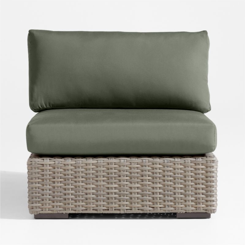 Low-slung and ready to lounge, our Abaco outdoor sectional collection extends an invitation to kick back and relax. Each armless chair is handwoven in grey-brown, weather-resistant resin wicker in a chunky, textural weave. The chair's modern, boldly proportioned frame of lightweight aluminum offers a deep seat. Neatly tailored with bullnose fronts and boxed sides, the off-white seat and back cushions add on a layer of comfort covered in fade-, stain-, water- and mildew-resistant Sunbrella acrylic. The armless chair with cushions combines with other Abaco sectional components to fashion outdoor seating tailored to your great outdoors.
