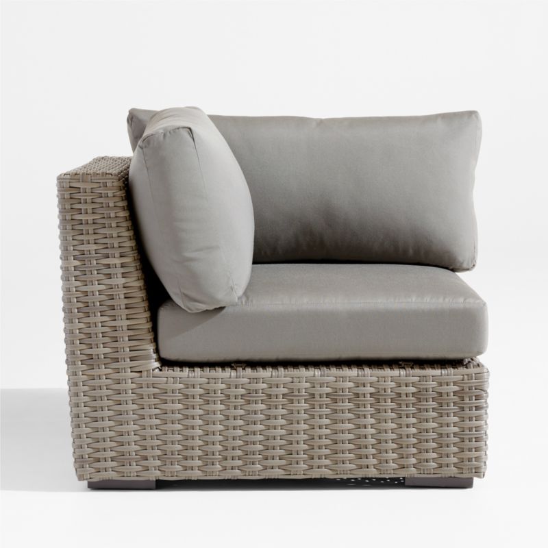 Low-slung and ready to lounge, our Abaco outdoor sectional collection extends an invitation to kick back and relax. Each corner chair is handwoven in grey-brown, weather-resistant resin wicker in a chunky, textural weave. The chair's modern, boldly proportioned frame of lightweight aluminum offers a deep seat. Neatly tailored with bullnose fronts and boxed sides, the grey seat and back cushions add on a layer of comfort covered in fade-, stain-, water- and mildew-resistant Sunbrella acrylic. The corner with cushions combines with other Abaco sectional components to fashion outdoor seating tailored to your great outdoors.