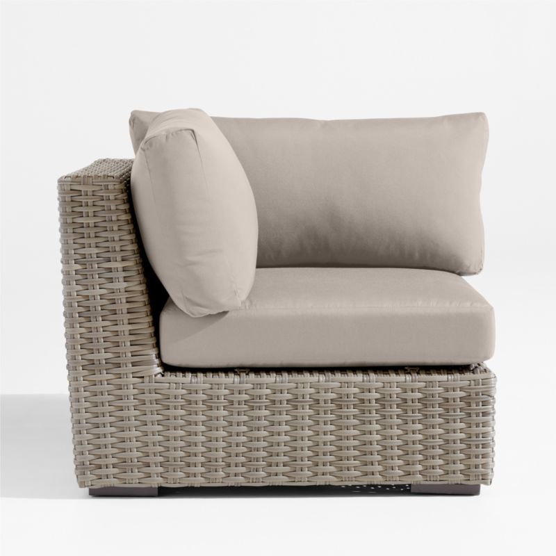 Low-slung and ready to lounge, our Abaco outdoor sectional collection extends an invitation to kick back and relax. Each corner chair is handwoven in grey-brown, weather-resistant resin wicker in a chunky, textural weave. The chair's modern, boldly proportioned frame of lightweight aluminum offers a deep seat. Neatly tailored with bullnose fronts and boxed sides, the off-white seat and back cushions add on a layer of comfort covered in fade-, stain-, water- and mildew-resistant Sunbrella acrylic. The corner with cushions combines with other Abaco sectional components to fashion outdoor seating tailored to your great outdoors.