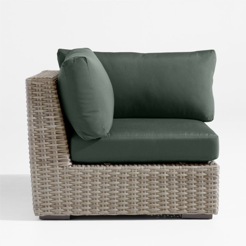Low-slung and ready to lounge, our Abaco outdoor sectional collection extends an invitation to kick back and relax. Each corner chair is handwoven in grey-brown, weather-resistant resin wicker in a chunky, textural weave. The chair's modern, boldly proportioned frame of lightweight aluminum offers a deep seat. Neatly tailored with bullnose fronts and boxed sides, the off-white seat and back cushions add on a layer of comfort covered in fade-, stain-, water- and mildew-resistant Sunbrella acrylic. The corner with cushions combines with other Abaco sectional components to fashion outdoor seating tailored to your great outdoors.
