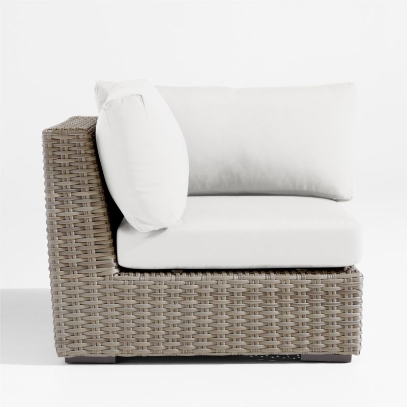 Low-slung and ready to lounge, our Abaco outdoor sectional collection extends an invitation to kick back and relax. Each corner chair is handwoven in grey-brown, weather-resistant resin wicker in a chunky, textural weave. The chair's modern, boldly proportioned frame of lightweight aluminum offers a deep seat. Neatly tailored with bullnose fronts and boxed sides, the off-white seat and back cushions add on a layer of comfort covered in fade-, stain-, water- and mildew-resistant Sunbrella acrylic. The corner with cushions combines with other Abaco sectional components to fashion outdoor seating tailored to your great outdoors.