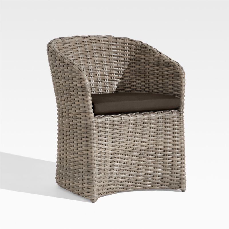 Handwoven with a chunky, textural weave, Abaco curves a graceful barrel-back dining chair in weather-resistant resin wicker. Exhibiting a variety of grey-brown shades, the wicker replicates the nuanced color of well-worn rattan.