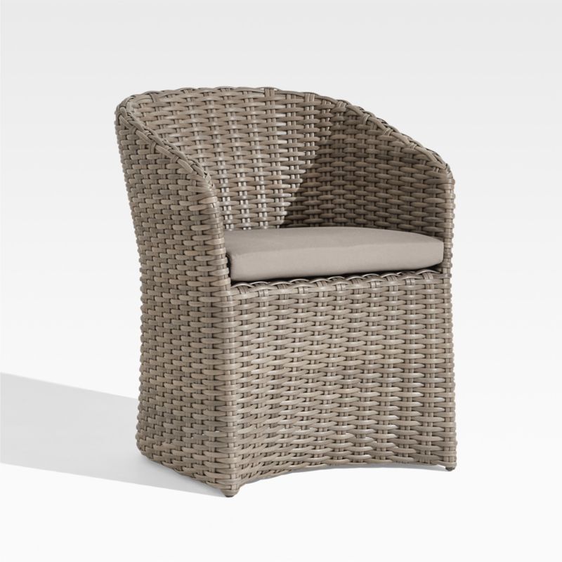 Handwoven with a chunky, textural weave, Abaco curves a graceful barrel-back dining chair in weather-resistant resin wicker. Exhibiting a variety of grey-brown shades, the wicker replicates the nuanced color of well-worn rattan.