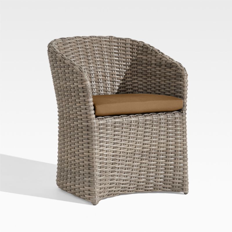 Handwoven with a chunky, textural weave, Abaco curves a graceful barrel-back dining chair in weather-resistant resin wicker. Exhibiting a variety of grey-brown shades, the wicker replicates the nuanced color of well-worn rattan.