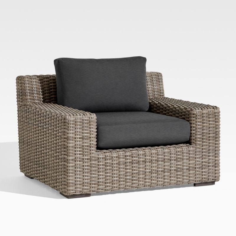 Low-slung and ready to lounge, our Abaco outdoor lounge chair extends an invitation to kick back and relax. Handwoven with a chunky, textural weave, the weather-resistant resin wicker exhibits a variety of grey-brown shades to replicate the nuanced color of well-worn rattan. The bold, modern frame of lightweight aluminum offers a deep seat and wide, boxy arms perfect for a cool drink. Cushions covered in fade-, stain-, water- and mildew-resistant Sunbrella acrylic adds an extra layer of comfort.