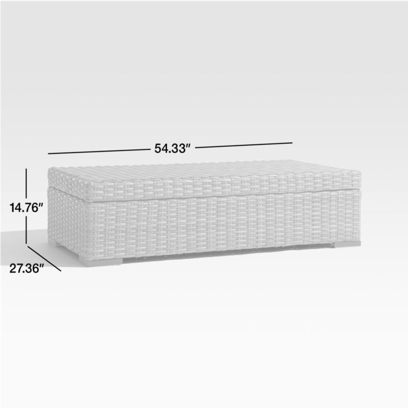 Designed to coordinate with our Abaco outdoor lounge collection, this versatile storage chest doubles as a coffee table. The sleekly designed chest displays a handwoven exterior of all-weather resin wicker with chunky texture and the nuanced color of natural fiber. The top opens up to a generous storage area, perfect for storing pillows, throws and outdoor supplies. The Abaco outdoor storage chest is a Crate & Barrel exclusive.