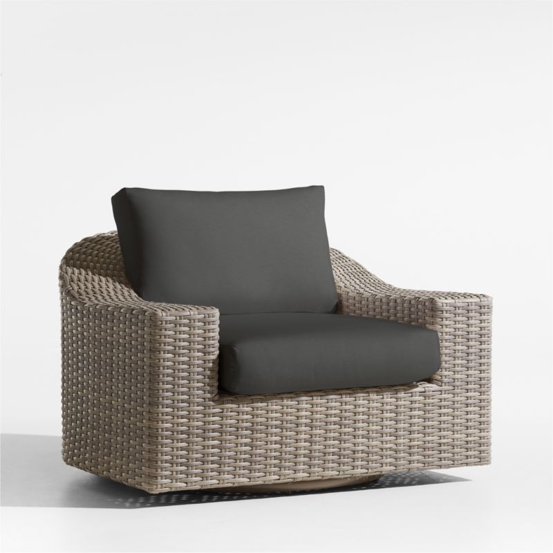 Low-slung and ready to lounge, our Abaco outdoor swivel lounge chair extends an invitation to kick back and relax. Handwoven with a chunky, textural weave, the weather-resistant resin wicker exhibits a variety of taupe shades to replicate the nuanced color of well-worn rattan. The bold, modern swivel chair offers a deep seat, gracefully curved back and wide, boxy arms perfect for a cool drink. A cushion covered in stain- and fade-resistant Sunbrella adds an extra layer of comfort.