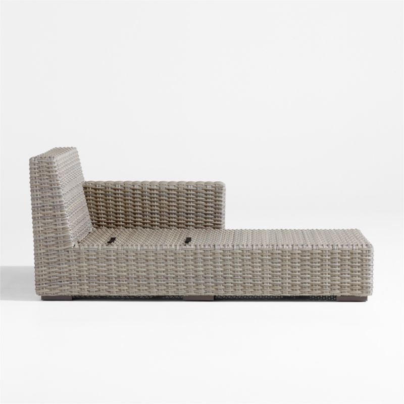 Low-slung and ready to lounge, our Abaco outdoor sectional collection extends an invitation to kick back and relax. Each right-arm chaise is handwoven in grey-brown, weather-resistant resin wicker in a chunky, textural weave. The chaise's modern, boldly proportioned frame of lightweight aluminum offers a deep seat and a wide, boxy arm that's perfect for hosting a cool drink. Add on a layer of comfort with custom-designed cushions in a range of colors (sold separately). The right-arm chaise lounge combines with other Abaco sectional components to fashion outdoor seating tailored to your great outdoors.