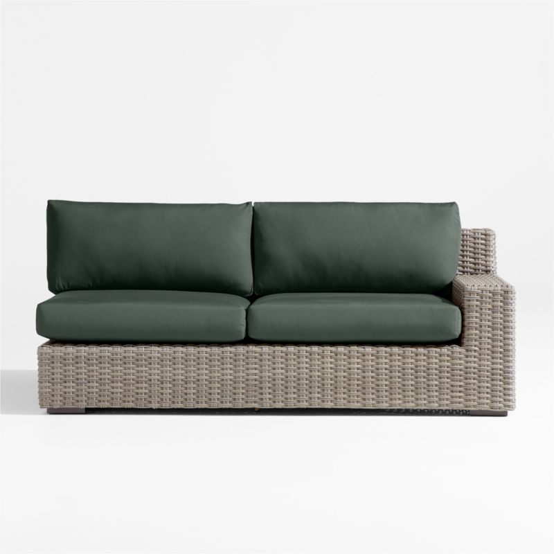 Low-slung and ready to lounge, our Abaco outdoor sectional collection extends an invitation to kick back and relax. Each right-arm sofa is handwoven in grey-brown, weather-resistant resin wicker in a chunky, textural weave. The sofa's modern, boldly proportioned frame of lightweight aluminum offers a deep seat and a wide, boxy arm that's perfect for hosting a cool drink. Neatly tailored with bullnose fronts and boxed sides, the off-white seat and back cushions add on a layer of comfort covered in fade-, stain-, water- and mildew-resistant Sunbrella acrylic. The right-arm sofa with cushions combines with other Abaco sectional components to fashion outdoor seating tailored to your great outdoors.