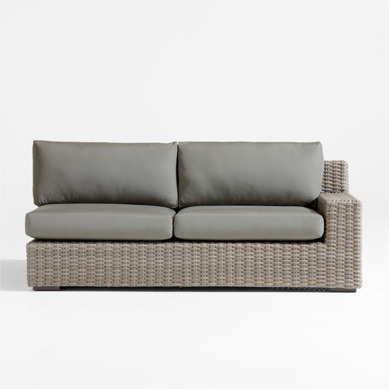 Low-slung and ready to lounge, our Abaco outdoor sectional collection extends an invitation to kick back and relax. Each right-arm sofa is handwoven in grey-brown, weather-resistant resin wicker in a chunky, textural weave. The sofa's modern, boldly proportioned frame of lightweight aluminum offers a deep seat and a wide, boxy arm that's perfect for hosting a cool drink. Neatly tailored with bullnose fronts and boxed sides, the grey seat and back cushions add on a layer of comfort covered in fade-, stain-, water- and mildew-resistant Sunbrella acrylic. The right-arm sofa with cushions combines with other Abaco sectional components to fashion outdoor seating tailored to your great outdoors.