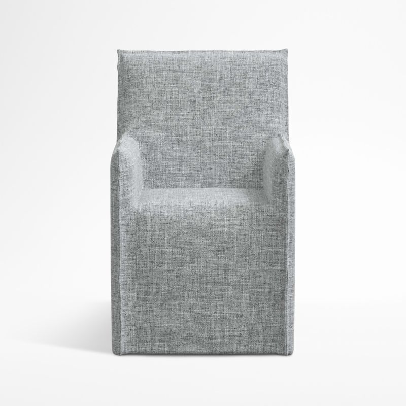 Our slipper-style dining chair is all dressed for dinner, donning a light grey slipcover that manages to look both casual and elegant. Skimming the hardwood frame and generously padded seat, the full-length slipcover has an informal, unconstructed air, minimally detailed by hand with French seams in the front and along the back. We love the slipcovered dining chair's graceful silhouette and to-the-floor coverage.