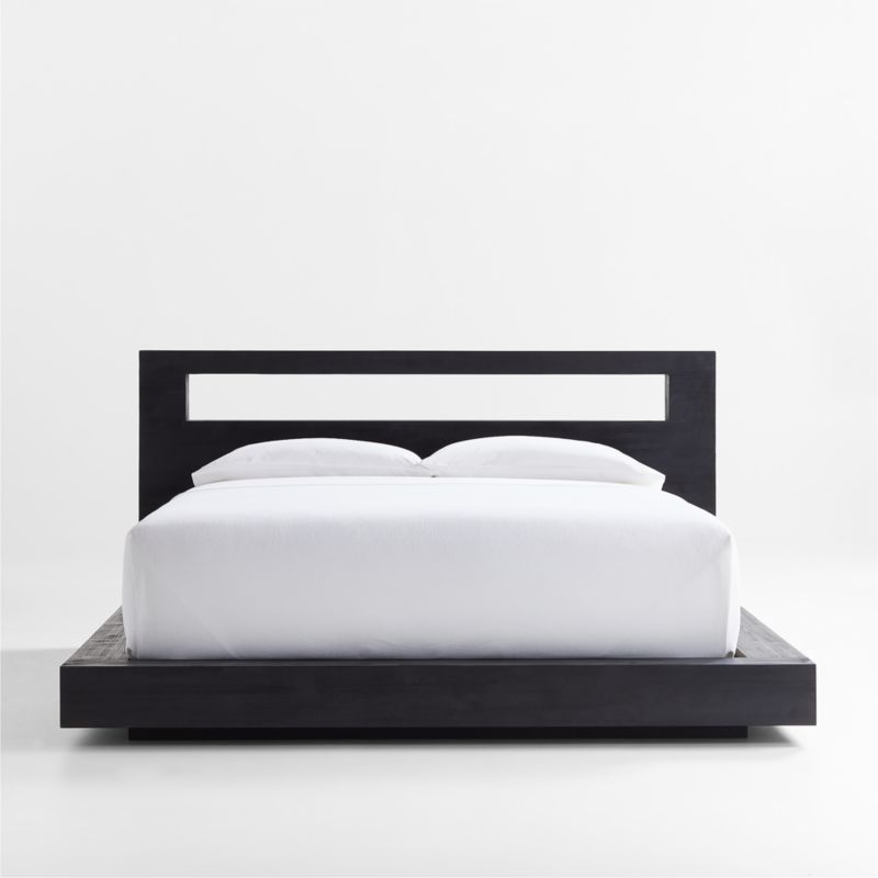 Low to the floor and distinctly modern, our Adia bed has a hidden plinth base that lets it float in the bedroom. Prominent wirebrushing and a dark charcoal finish give the wood bed the look of "shou sugi ban," the Japanese art of preserving wood by charring it with fire. The headboard's open shelf lightens the look while providing an easy-to-access surface to store books, devices and decor. The Adia black wood bed is a Crate & Barrel exclusive.