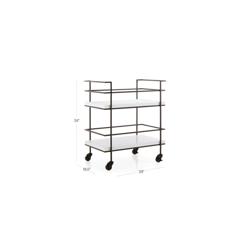From kitchen to party room, our Adina cart gets things rolling. Black-finished iron outlines the cart's linear frame outfitted with two white concrete shelves to hold cocktail essentials or after-dinner dessert and coffee service. Smartly angled handles and protective rails make it easy to wheel the mixed-material cart to wherever the action is. We love Adina's graphic contrast between black and white as well as its pairing of rustic concrete and sleek metal. The Adina Black Cart with White Concrete Shelves is a Crate and Barrel exclusive.