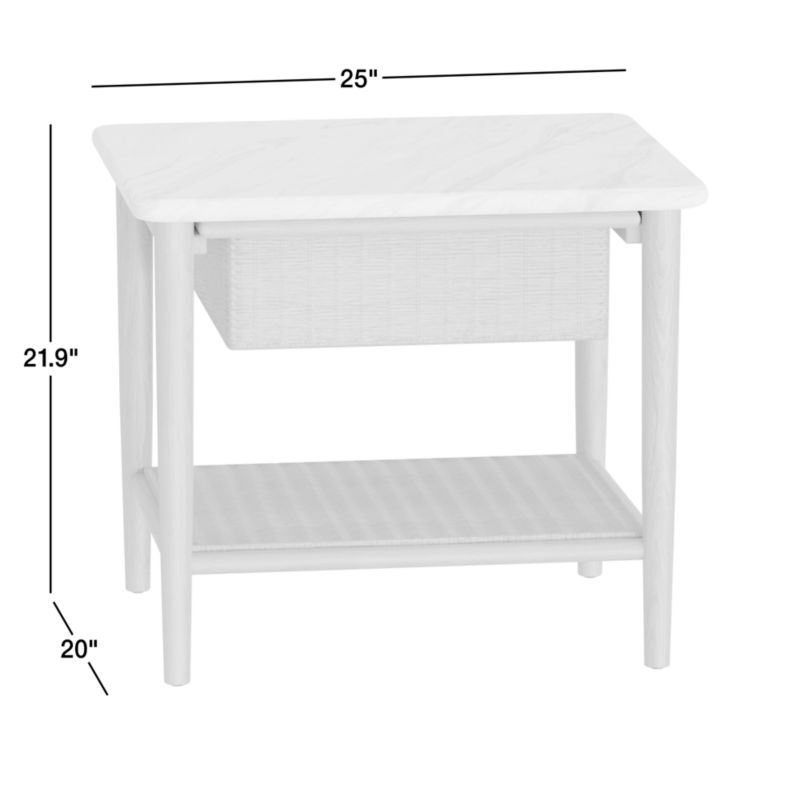 The cool elegance of marble and the casual warmth of rattan unite in our Aeree side table. The solid oak frame features slender turned legs and an open silhouette. Complementing the wood's light rye finish, a marble top showcases white, grey and beige veining that's unique to each piece. Handwoven rattan brings in natural color and breezy texture as an open shelf and a single drawer that floats storage. Classic and modern, the side table is perfect for today's transitional home.