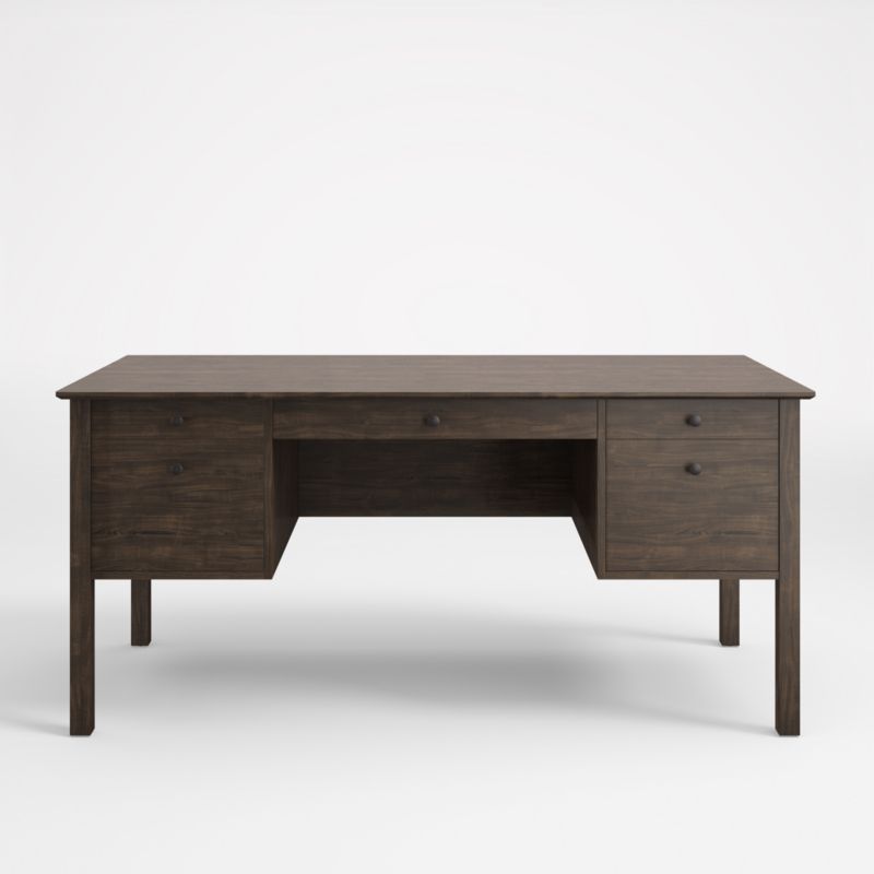 Elegantly crafted of black cherry, this clean-styled desk provides an elegant workspace with plenty of storage. Our handsome, straightforward writing desk has sets of supply and file drawers outfitted with dark antique steel knobs that complement the warm maple. Conditioned with linseed and mineral oils, this office essential showcases the wood's natural beauty with a charcoal finish. Our exclusive Ainsworth storage collection offers clean and versatile styling to create a timeless media, storage, and home office solution. The Ainsworth desk is certified for commercial use, its simple, classic design characterizing the longevity the collection has to offer.