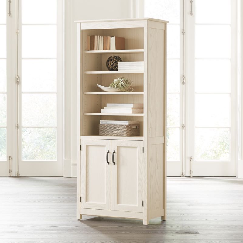 The media console offers a choice of door panels, allowing the piece to transition from open to closed storage. Cutouts provide ventilation as well as cord management for media components. Stocked with dark antique steel pulls, the media console also has the option of matching wood pulls. The Ainsworth Cream 85" Media Console with Glass/Wood Doors is a Crate and Barrel exclusive.