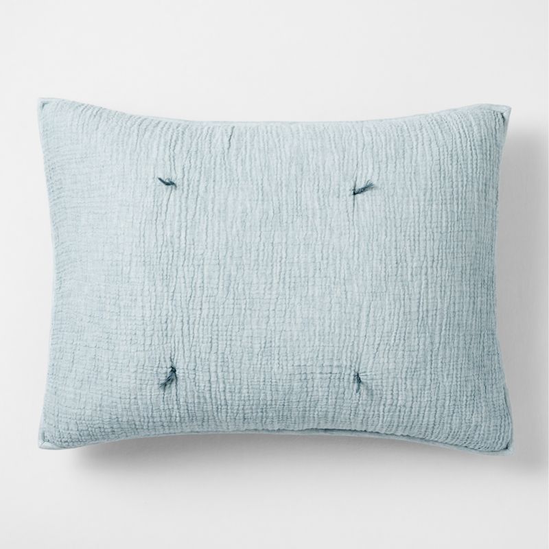 Soft and airy, like sleeping on a cloud. Our cotton sham features a double layer of gauzy crinkle fabric on the front accented with delightful thread tufts to add to the cozy factor. A smooth cotton-linen reverse and self piping around the edges gives the sham a tailored finish. Pair the blue sham with the matching Aire quilt for a snuggle-soft bed that's made for dreaming deep.