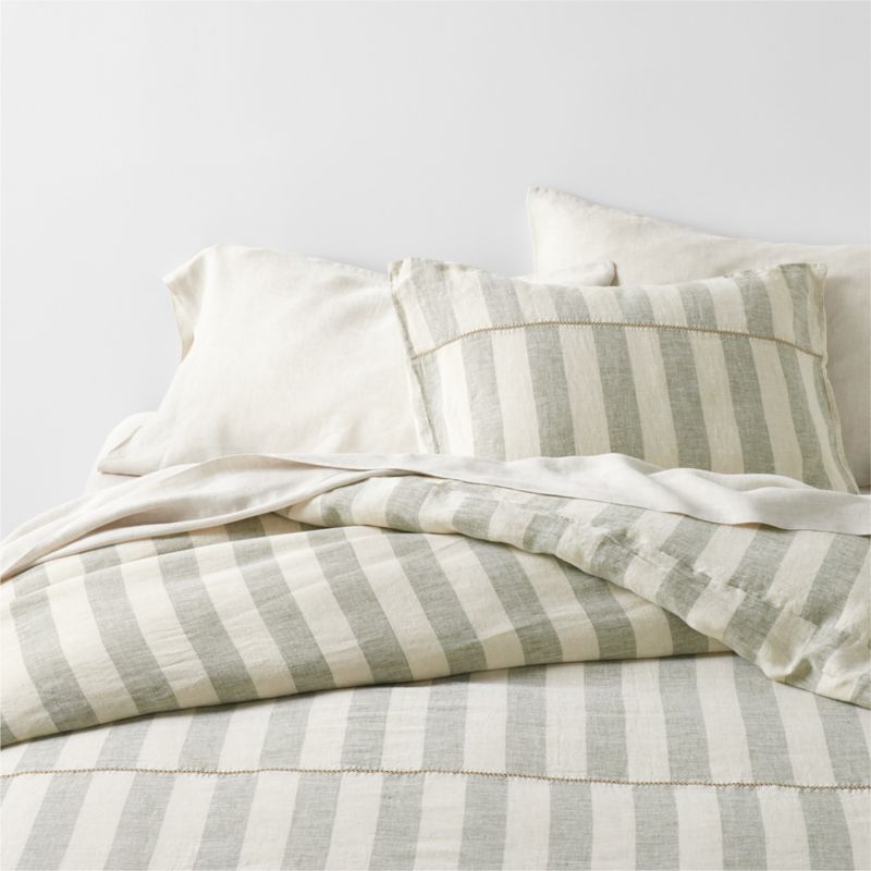 Our breezy cabana stripe duvet cover transforms your bed into a coastal oasis. Classic cabana stripes get a modern update in muted, earthy green and creamy tan, offset and rejoined with an exquisitely embroidered piecing seam. The sustainable linen duvet joins the matching pillow sham and coordinating sheets from our linen collection to make a laid-back, beachy bed.