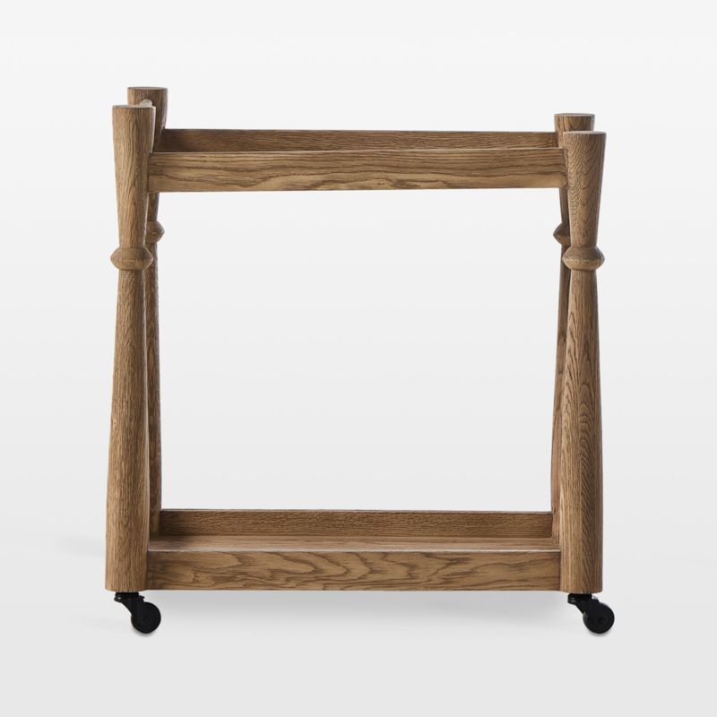 Light washed oak and turned wood details elevate this bar cart beyond the ordinary. Key to Alamosa's eye-catching allure are the turned wood supports with knob accents defining the waist of their slim hourglass tapers. Tray-shaped shelves provide ample space for bottles, glasses, ice buckets and garnishes, while a pert handle makes it easy to steer the cart on its black castor wheels.
