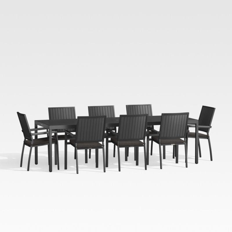 Easy, breezy Alfresco has a contemporary look that always feels fresh. Well-made with waterproof materials, it's designed to welcome warm-weather entertaining season after season. The dining table and chair set is made of rustproof aluminum twith faux wood slats that emulate the look of real wood is finished in a durable black powdercoat. Seat cushions are covered in Sunbrella fabric, an unrivaled outdoor performance material.