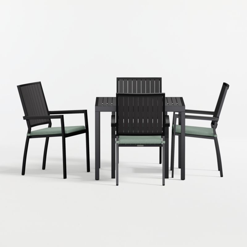 Easy, breezy Alfresco has a contemporary look that always feels fresh. Well-made with waterproof materials, it's designed to welcome warm-weather entertaining season after season. The dining table and chair set is made of rustproof aluminum with faux wood slats that emulate the look of real wood is finished in a durable black powdercoat. Seat cushions are covered in Sunbrella fabric, an unrivaled outdoor performance material.