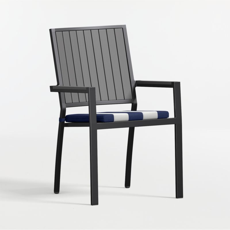 Alfresco Black Metal Outdoor Dining Armchair with Navy and White Cabana Stripe Sunbrella ® Cushion