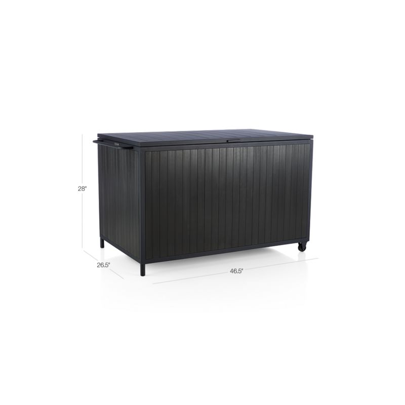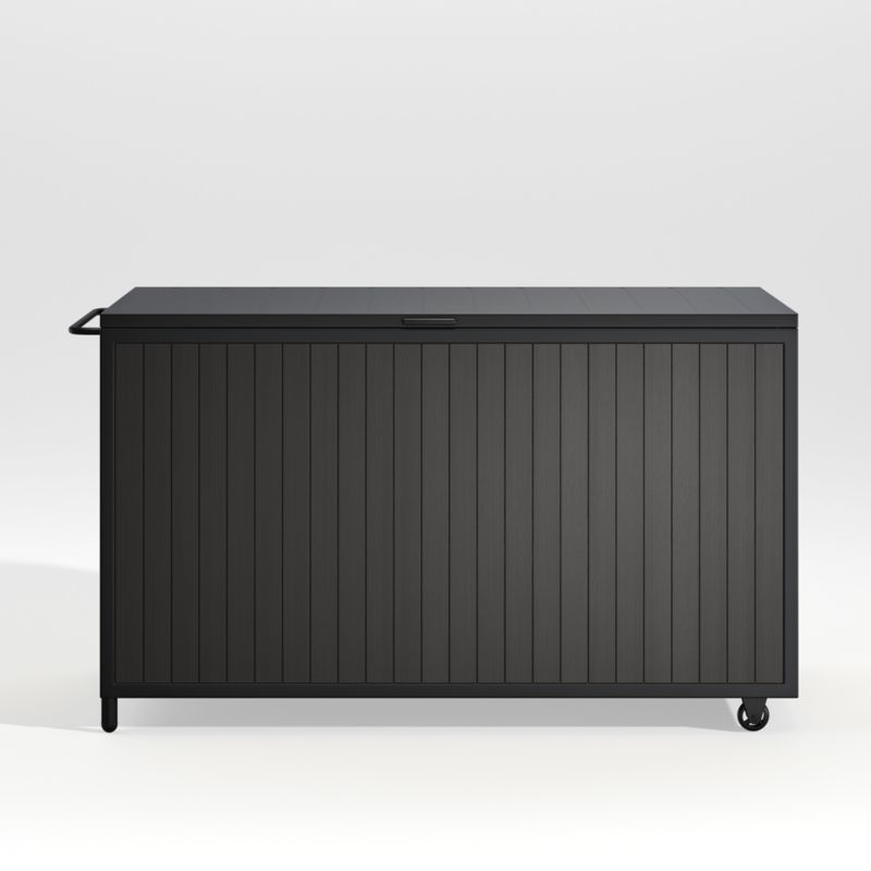 Our Alfresco outdoor furniture collection emulates the look of real wood with clean lines and all-weather durability. Finished in sleek black, the storage box sets faux wood slats within a sturdy yet lightweight aluminum frame. The top lifts to ample storage space for stowing cushions, pillows, blankets or more. Two wheels let the box move about as an extra serving station or bar.